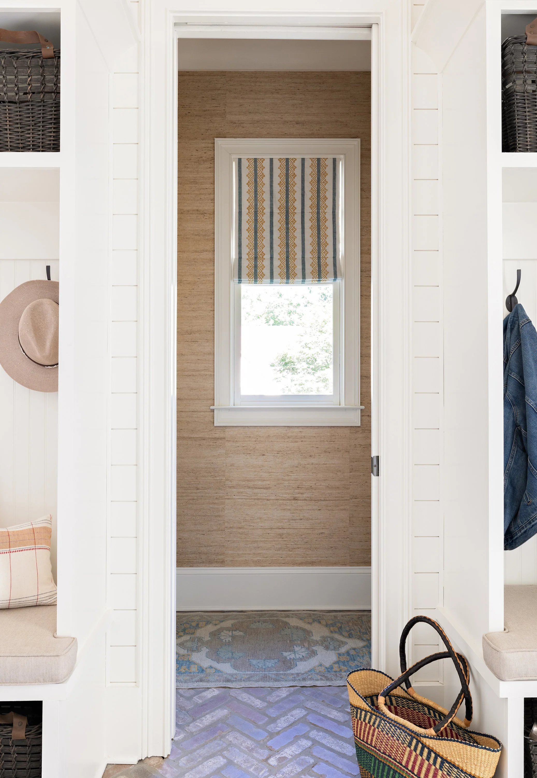 As their children grew from toddlers to elementary schoolers, this family refreshed their main level with a blend of elegance and functionality. The design reclaims the dining room, once a playroom, as a sophisticated yet welcoming space with floral drapery adding color to the neutral palette. Herringbone brick flooring elevates the mudroom and powder room, while seagrass wallcoverings and tongue-and-groove panels bring warmth and texture. A living room nook became a chic bar, and a custom square table and Oushak rug enhance the breakfast room’s symmetry. Performance fabrics ensure practicality, while a commissioned Sally King Benedict artwork adds a modern touch.